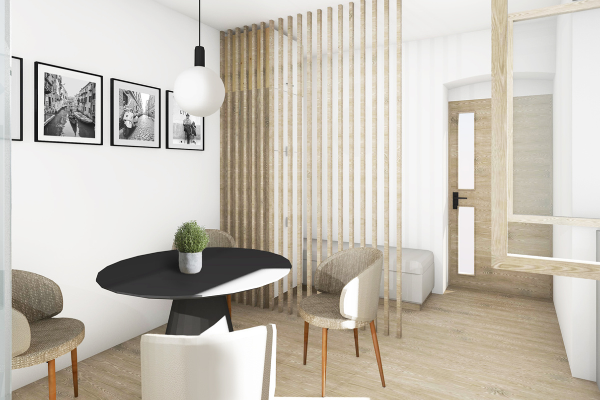 A tervezés során a tulajdonos olasz kulturális háttere és személyes szenvedélye – az itáliai országúti kerékpározás – inspiráló kiindulóponttá vált. Célunk az volt, hogy ez a szenvedély ne pusztán dekorációként jelenjen meg, hanem játékos, kreatív módon szövődjön bele az enteriőr részleteibe. Így született meg például a régi biciklikormányból kialakított kabátakasztó, amely egyszerre humoros és funkcionális elem az előtérben. A biciklikerekekből készített világítótestek egyszerre funkcionálisak, és mindeközben finoman utalnak a sport iránti szenvedélyre is.