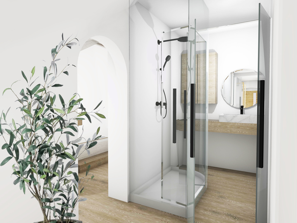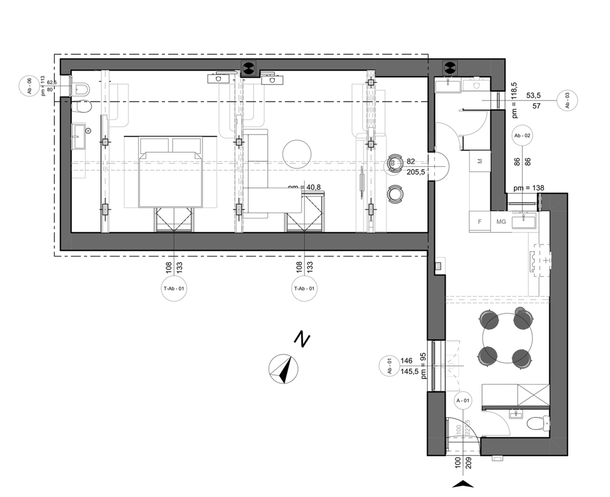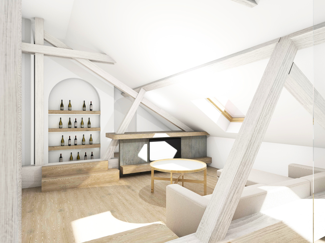 A lakás tulajdonosa olasz, aki számára Budapest kedvelt úti cél, ezért olyan otthont szeretett volna létrehozni, amely látogatásai során kényelmesen befogad négy főt. Fontos szempont volt, hogy minden hálóhoz saját fürdőszoba kapcsolódjon, így a lakás egyszerre tud vendégbarát és intim maradni. A térérzet megőrzése érdekében a helyiségek leválasztását több ponton üvegfalakkal oldottuk meg. Az áttetsző határolások lehetővé tették, hogy a tetőtér karakteres gerendarendszere végig látható maradjon, miközben a funkcionális zónák mégis egyértelműen elkülönülnek.